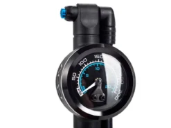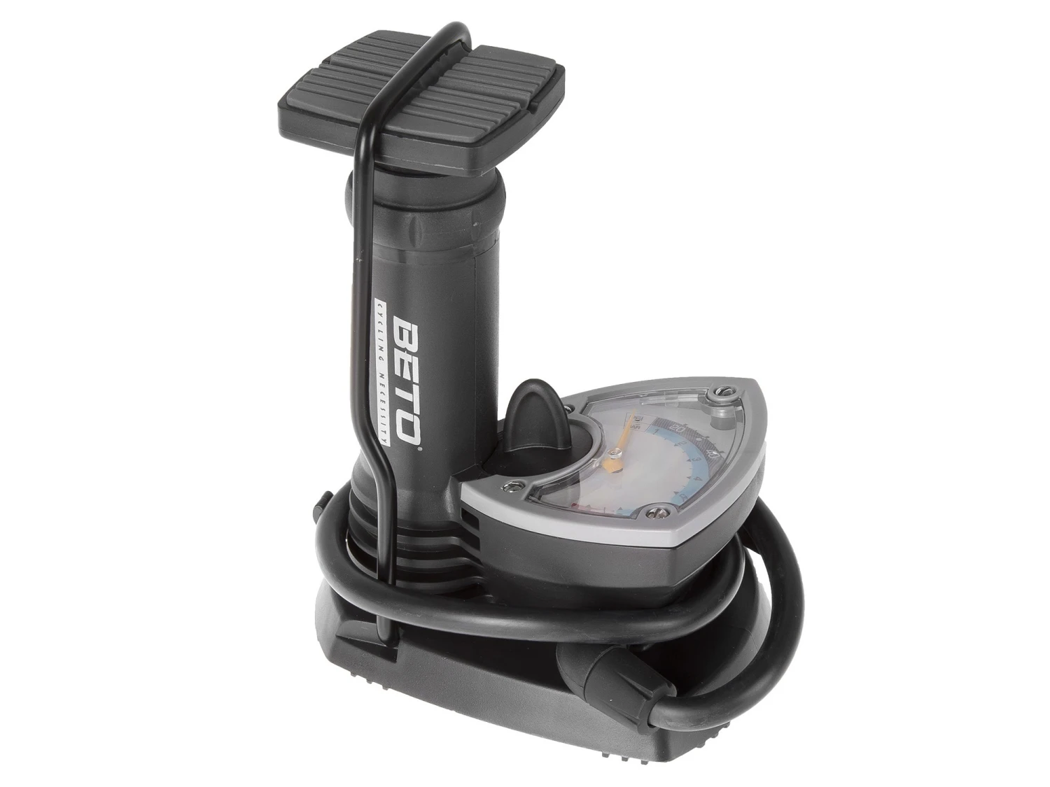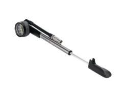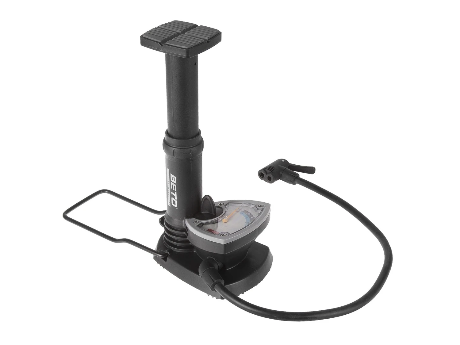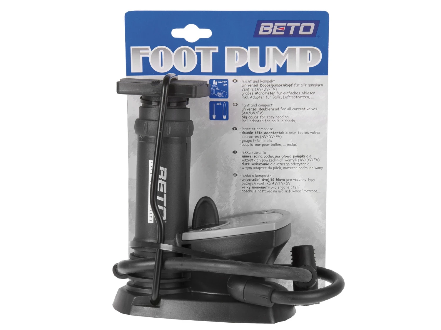 Denne fodpumpe er i sandhed en fodpumpe; du pumper den nemlig med foden ved at træde ned på fodpladen. Den kan pumpe alle ventiler og helt op til 7 bar / 100 PSI. Der følger sågar adapter med til luftmadrassen og fodbolden.