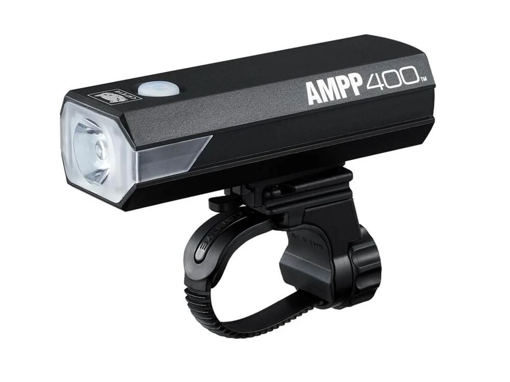 Cateye Ampp er en smart, lovlig og kompakt forlygte fra Cateye med en lyseffekt på hele 400 lumen. Forlygten har 4 forskellige lysstyrkeindstillinger; høj/lav/HyperConstant/blink. Det ekstra smarte ved lige netop denne forlyggte er, at batteriet er genopladeligt, og der derfor ikke skal skifte batterier i tide og utide. I stedet oplades batteriet blot ved hjælp at et USB-indgangen, og efterfølgende er forlygten igen klar til brug på 3 timer.