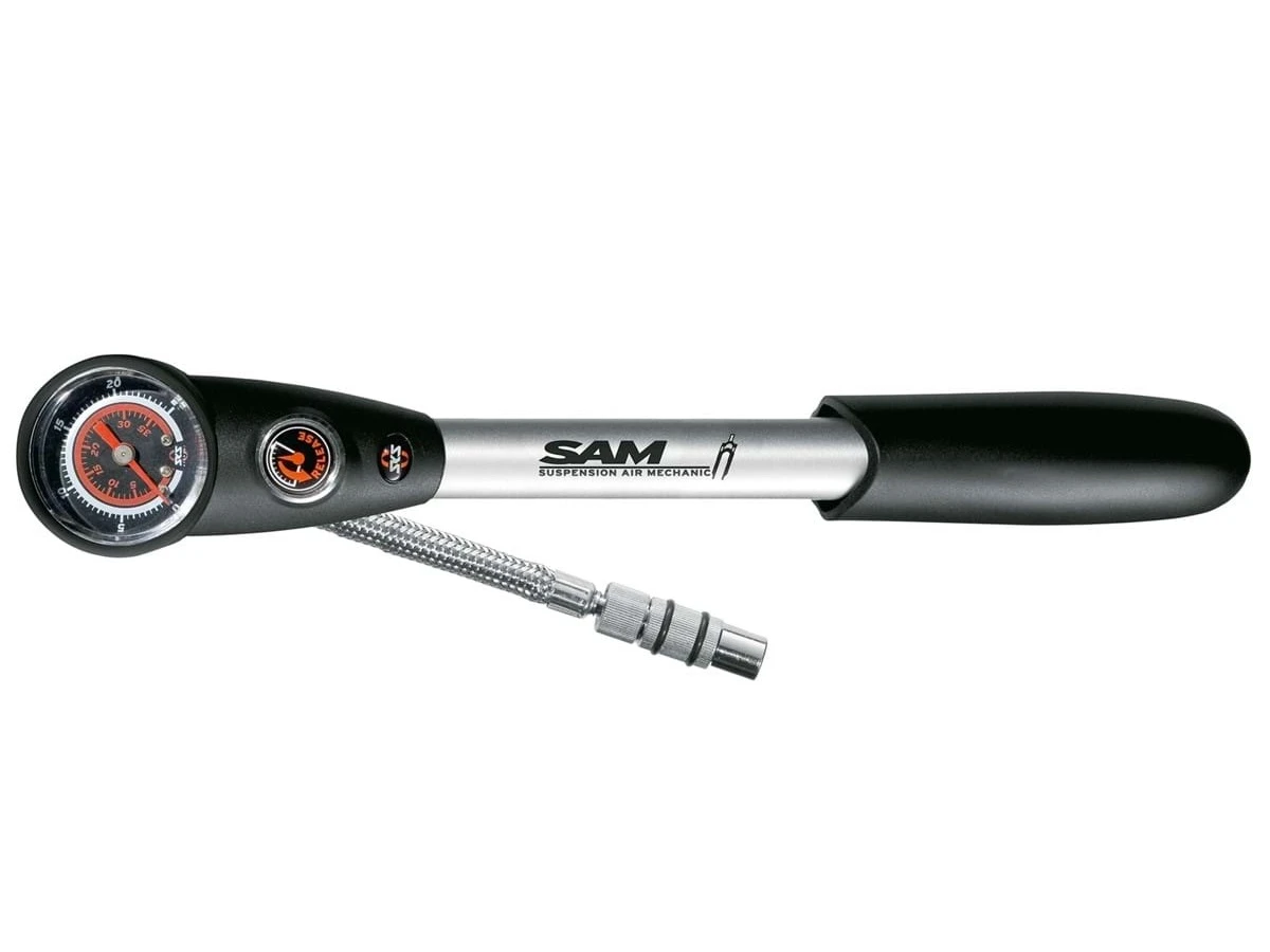 SKS Sam er en pumpe, der er specielt designet til at justere lufttrykket i forgaflen på MTB. Airshock-pumpen er udstyret med manometer og har en lav vægt samt passer til stort set alle støddæmpere med schrader-ventil. Den fleksible slange gør pumpen yderst nem at anvende, og den kan pumpe op til 22 bar. Det er desuden muligt at lukke luft ud af støddæmperen ved hjælp af en lille knap på pumpen.